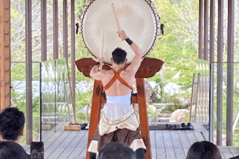 全国から集まり淡路島で活動する音楽家集団「音楽島」による和楽器の演奏を鑑賞し、大自然の静寂の中に響く和太鼓の迫力のある音色を全身で味わいました。