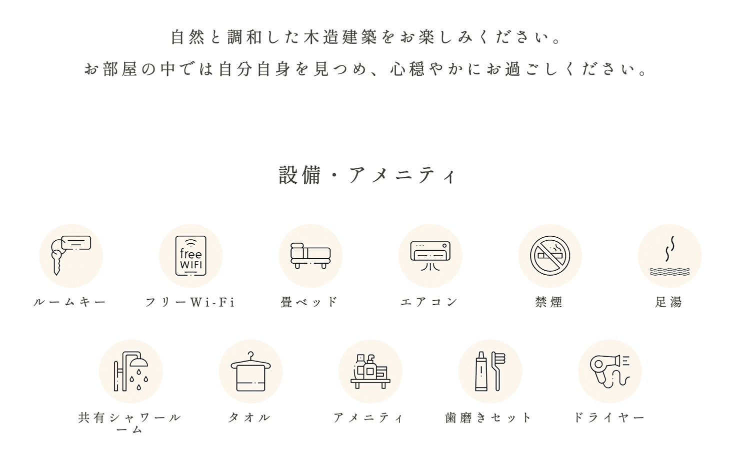 | 【服装】 | 動きやすい服装をご用意ください。部屋着・バスローブをご用意しておりませんのでご了承ください。 |
